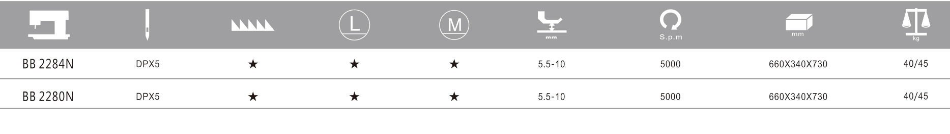 New type rotary thread take-up ensures uniform thread tensions under low-tension settings. Axis Hook acting in concel1 with compensation has been adopted, and the hook points to catch thread loop at equivalence to left and right, thereby reducing skip stitching and thread breakage considerably It's equipped with mini-lifter and presser foot which makes the presser foot up,and then sewing the flexible cloth with nice-looking and soft stitches. Winder is designed in particular so that the machine can be used with more convenience. 2284 can achieve sewing directly,2-step zigzag, 4-step zigzag and11 patterns zigzag with changing cam which increases the production efficiency